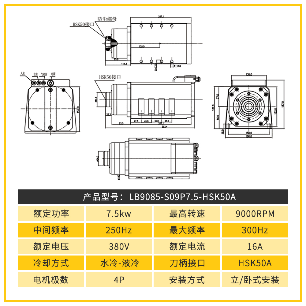 LB9085-S09P7.5-HSK50A(侧锁)手动换刀水冷主轴